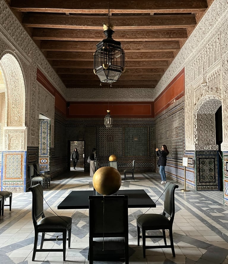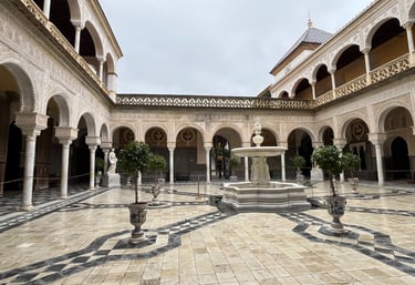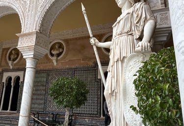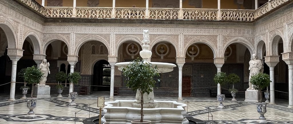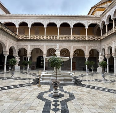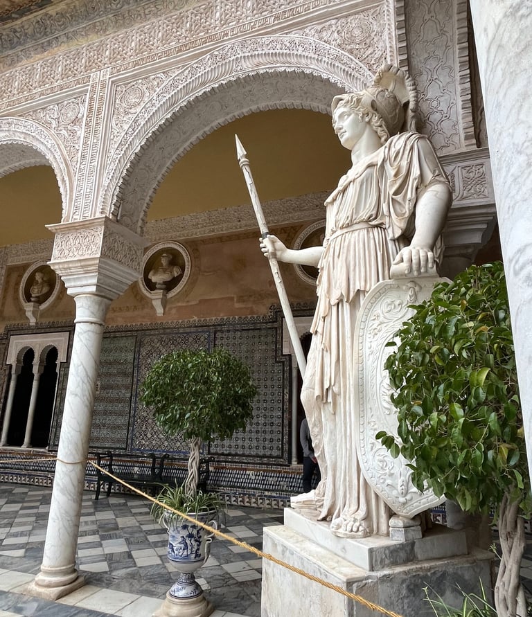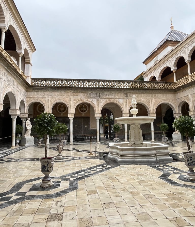 The central courtyard is the heart of the palace — a breathtaking space filled with geometric tiles, colonnaded walkways, palm trees, and classical sculptures. Light pours into the courtyard in the morning, making it an ideal spot for photos. It’s peaceful, atmospheric, and easily one of the most beautiful patios in Seville.
