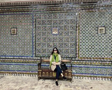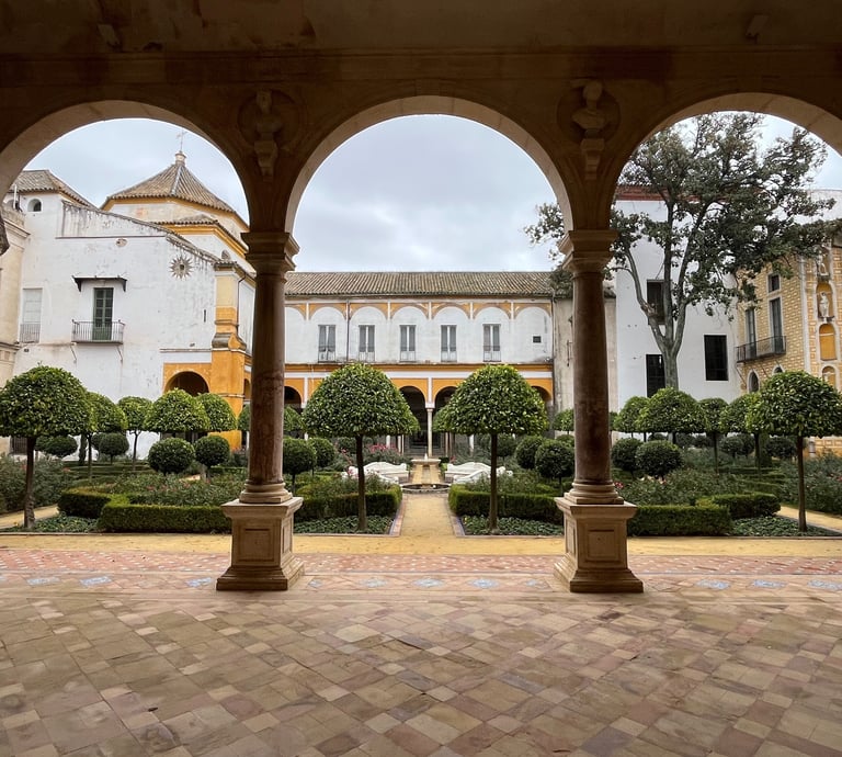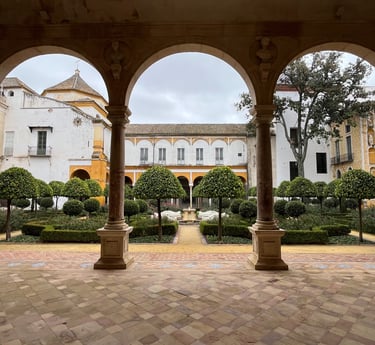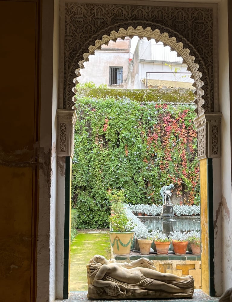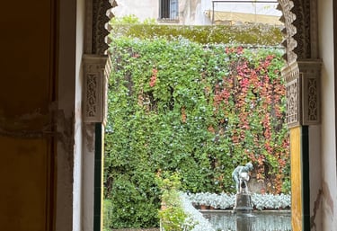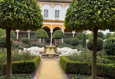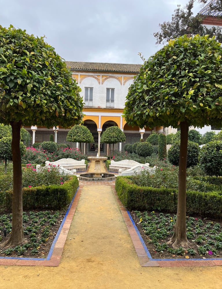Behind the palace lies a tranquil garden filled with lush greenery, bougainvillea, fountains, and shaded pathways. It’s a peaceful retreat — perfect for slow travel moments, photography, or simply escaping the busy streets of central Seville.
